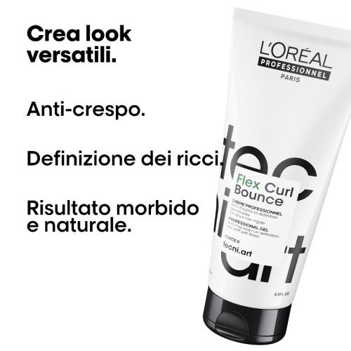Applicare L'Oréal Professionnel Tecni.Art Flex Curl Bounce sui capelli umidi per definire i ricci. Asciugare con il diffusore o lasciare asciugare all'aria.