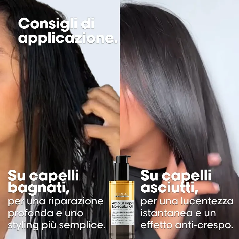L'Oreal Professionnel Absolut Repair Molecular Olio Bifasico contiene un legante peptidico + 5 amminoacidi per un capello visibilmente più riparato, luminoso e nutrito.
