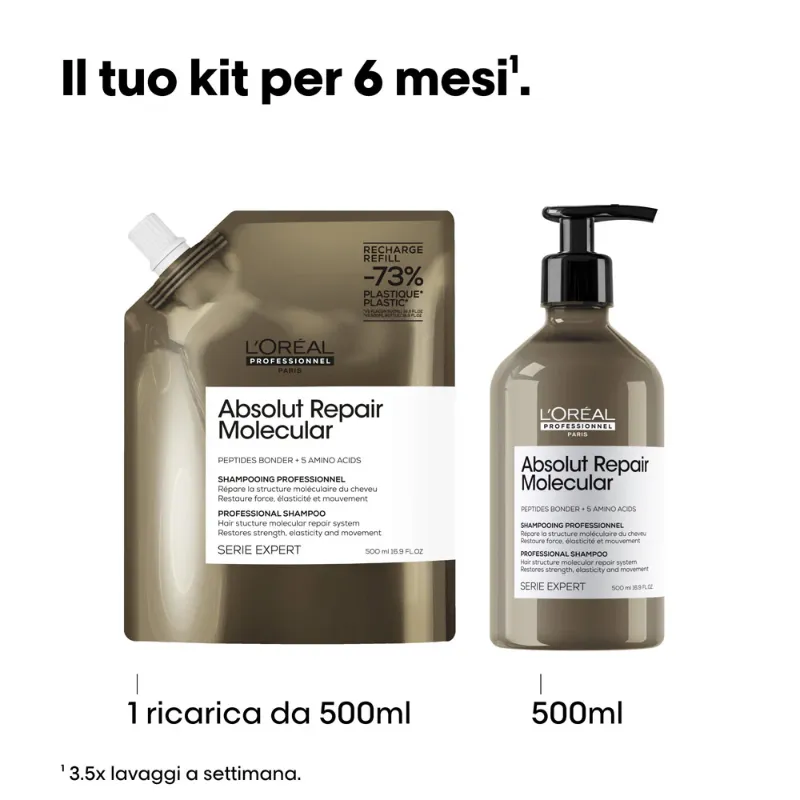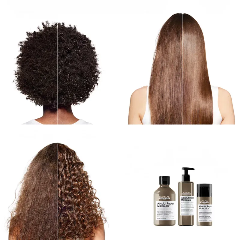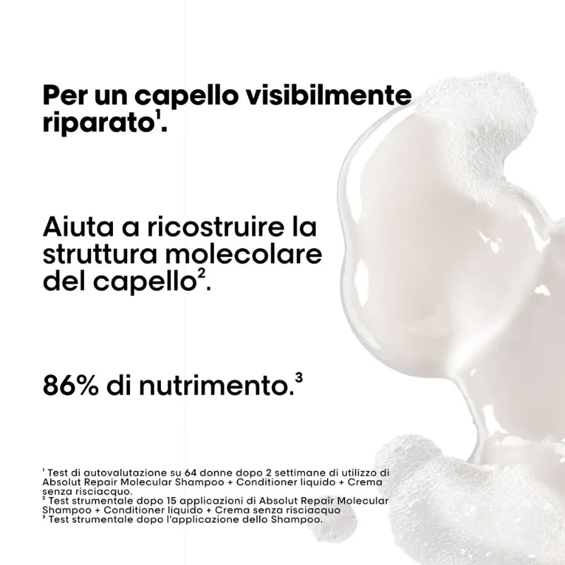 L'Oreal Professionnel Absolut Repair Molecular Shampoo è uno shampoo riparatore. Questo shampoo brevettato, formulato con Peptidi leganti + 5 Aminoacidi, ripara la struttura macromolecolare dei capelli. Quando i capelli sono danneggiati, la loro struttura molecolare, composta da peptidi, viene compromessa. La maggior parte dei peptidi è troppo grande per essere reiniettata nella fibra, rendendo il danno quasi irreversibile. Absolut Repair Molecular ripara 2 anni di danni, in un solo utilizzo. Per la prima volta, la Ricerca Avanzata L'Oréal è riuscita a scomporre i peptidi e a iniettare i loro componenti separatamente nella fibra. Una volta all'interno, si riformano e ricostruiscono la struttura molecolare del capello. I capelli sono più forti e nutriti, con una maggiore elasticità, movimento, e +86% di morbidezza. La texture lussuosa della formula si trasforma in una ricca schiuma, deterge, districa i capelli e offre un elevato livello di cura. Indicato per tutti i tipi di capelli danneggiati o molto danneggiati, colorati, schiariti e naturali.