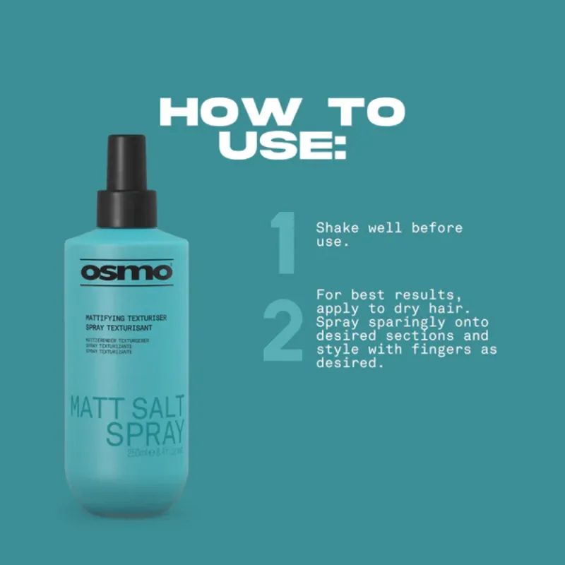 Utilizzare OSMO Matt Salt Spray da capello umido per una asciugatura naturale come capelli bagnati dall’acqua di mare, da asciutto per definire e rendere strutturata ogni tipo di piega