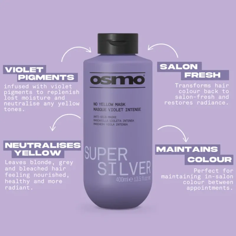 OSMO Super Silver No Yellow Mask è una maschera intensa con effetto anti-giallo. Non contiene solfati ed è specificatamente formulata per i capelli super schiariti, grigi o decolorati. Formulata con pigmenti viola super forti, la sua formula aiuta a rimuovere i toni gialli indesiderati. Il colore dei capelli si trasforma e si illumina.