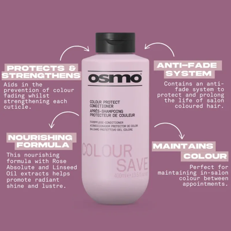 OSMO Color Save Conditioner è un balsamo nutriente per capelli colorati. Completamente privo di sali e solfati, contiene Filtri UV e Vitamina E per preservare la vitalità ed il benessere dei capelli colorati rafforzandone ogni singola cuticola. L’estratto di Olio di Semi di Lino aiuta a prevenire lo sbiadimento del colore, mentre l’estratto di Rosa Damasceno dona lucentezza e morbidezza.