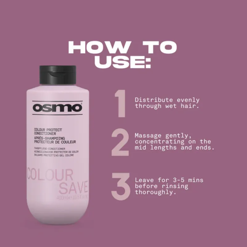 Dopo lo shampoo, distribuire uniformemente OSMO Color Save Conditioner su lunghezze e punte, massaggiare o pettinare e lasciare in posa 2/3 minuti. Risciacquare abbondantemente.