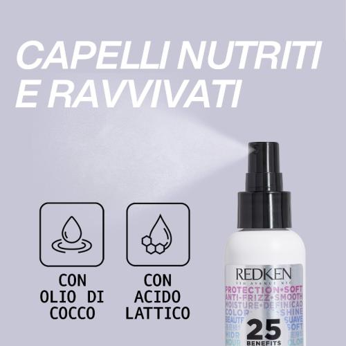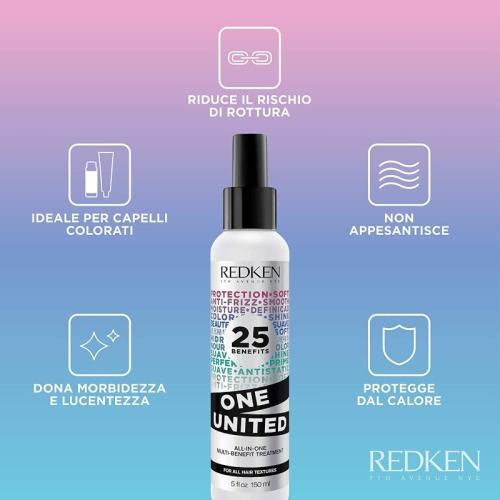 Si tratta di un unico prodotto sapientemente studiato per riuscire ad apportare risultati benefici sia a livello di trattamento che di protezione e cosmeticità. Ben 25 benefici racchiusi in un unico spray, ideale per chi desidera un prodotto comodo e facile da utilizzare. Redken One United rende la chioma più facile da gestire e allo stesso tempo la difende dai più comuni danni che colpiscono la fibra capillare e ne esalta la naturale bellezza. Indicato per qualsiasi tipo di capigliatura, One United è indicato soprattutto per chi ha bisogno di nutrie, idratare e ricondizionare i propri capelli. In particolar modo, i capelli colorati o chimicamente trattati traggono immediato beneficio dall'utilizzo di questo spray. L'azione districante di One United, inoltre, velocizza lo styling, protegge il capello dall'utilizzo di strumenti a caldo (come phon e piastra) ed elimina il fastidioso effetto crespo. Il risultato è un capello più sano e più lucido, meno soggetto al rischio di rottura e alla comparsa delle doppie punte. Grazie ai suoi filtri UV è ideale per proteggere i capelli durante l'estate dall'esposizione al sole, al vento, al cloro e alla salsedine.