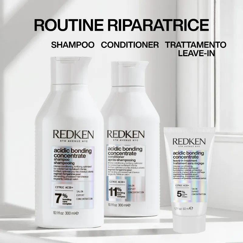 ** Utilizzando il Sistema complete di Acidic Bonding Concentrate Shampoo, Conditioner & Leave-in Treatment
